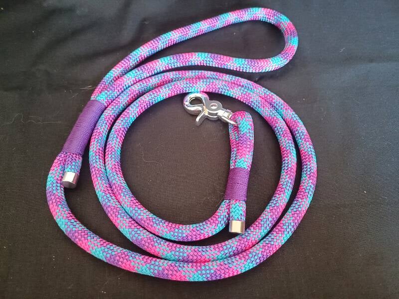 Laisse " Néon rose" avec fil de finition violet et bouclerie "argent".
